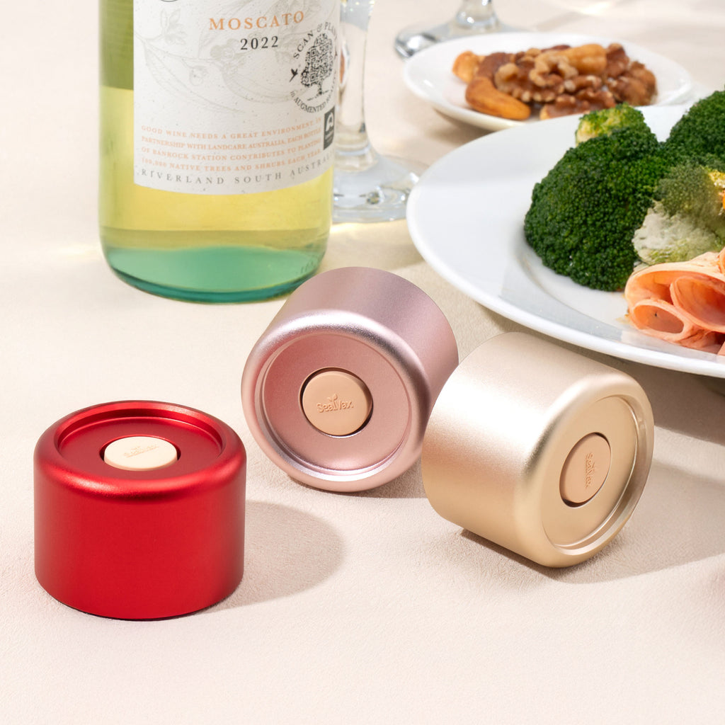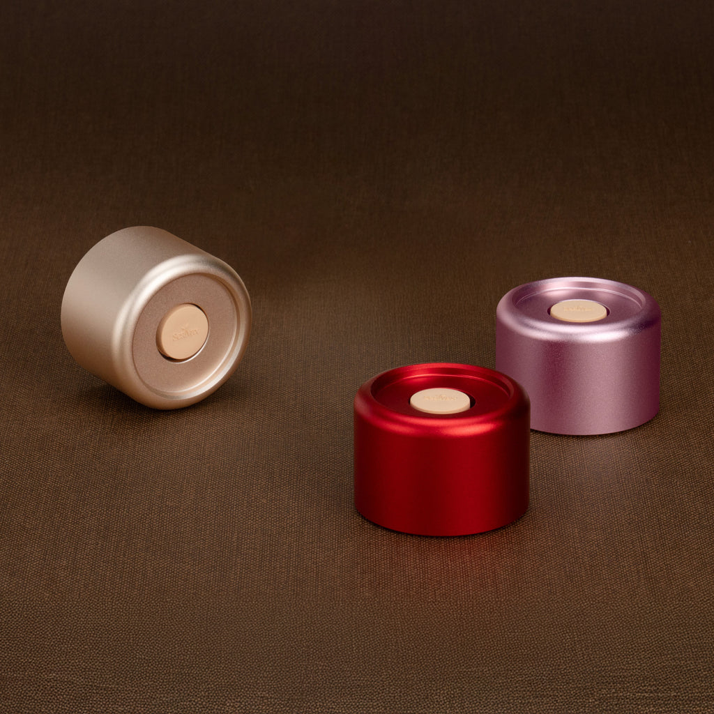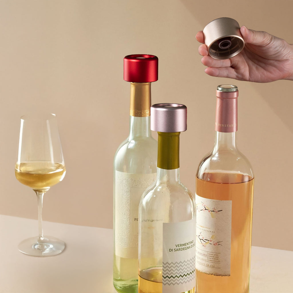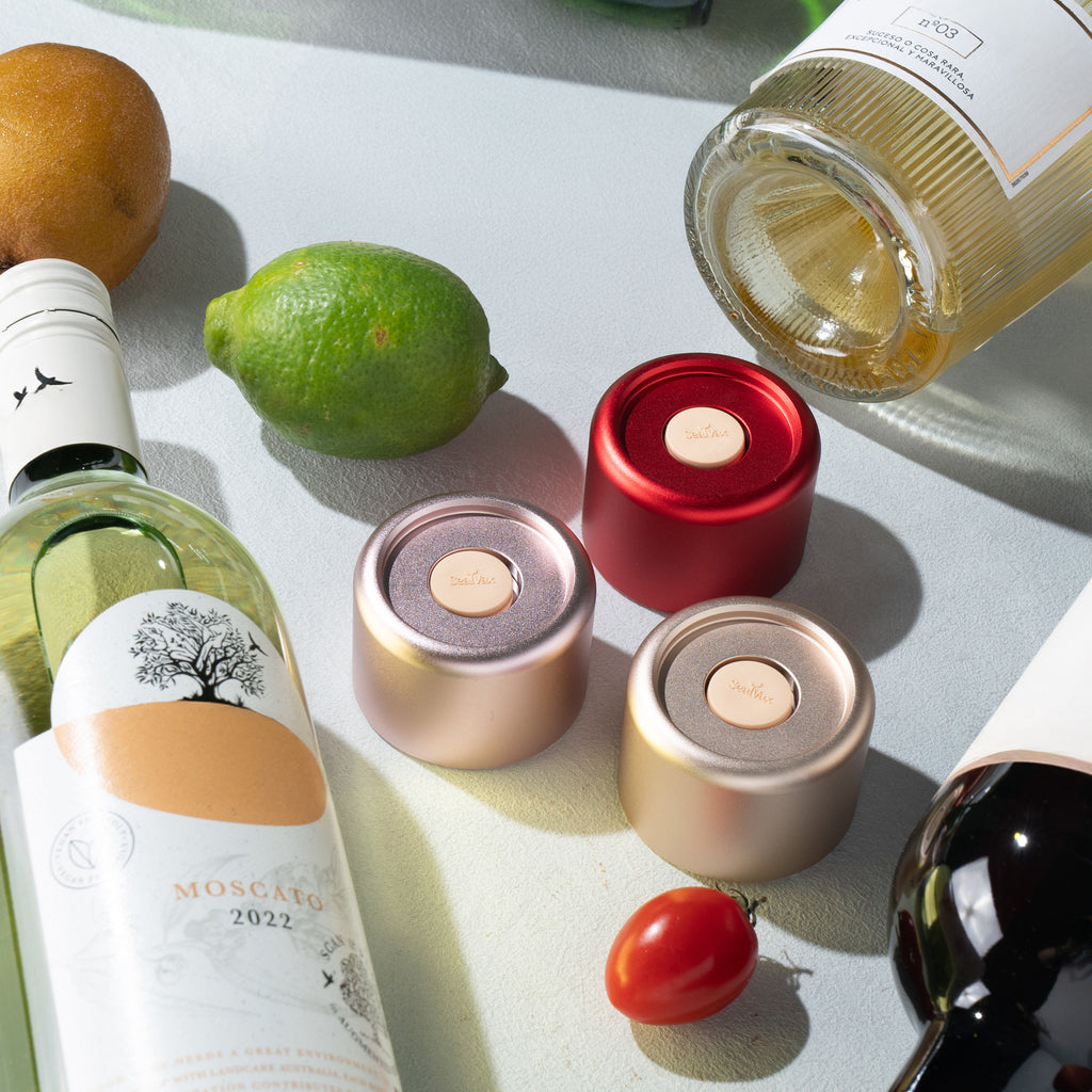 VinCap Stoppers in beautiful colors, made of durable metal with food-grade seal.